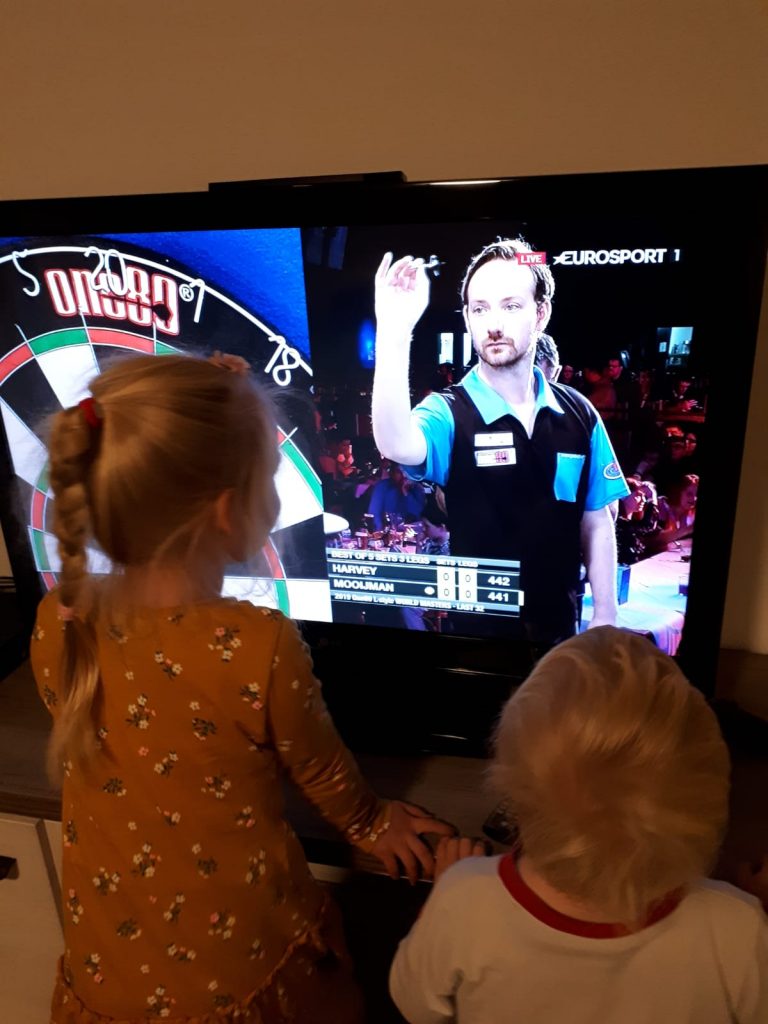 Het zal mijn trouwe volgers niet ontgaan zijn, dat ik recent mijn eerste grote tv-wedstrijden heb gespeeld op de One80 L-Style World Masters. Als reactie daarop ben ik bedolven onder reacties van niet alleen vrienden en familie, maar ook (oud)-collega’s, team- en klasgenoten. Velen van jullie stuurden me foto’s van hoe er gekeken werd en daarom leek het me leuk om daar een collage van te maken, aangevuld met mijn eigen foto’s van achter de schermen.
